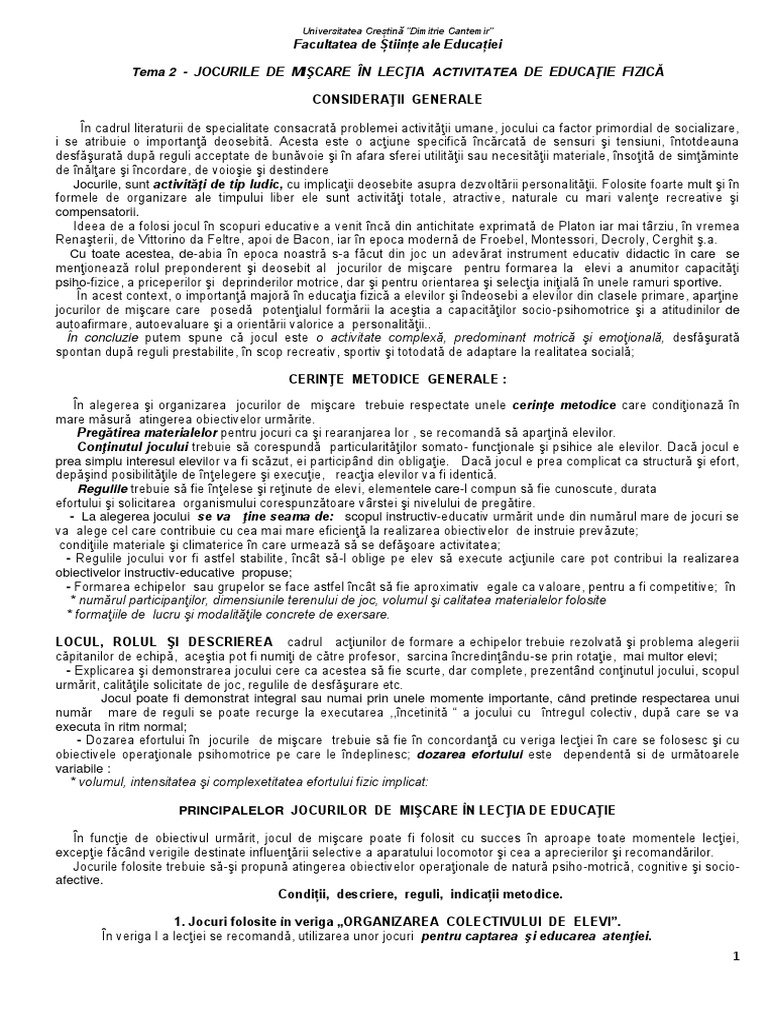 Tema 2 Jocurile De Miscare In Lectia De Educatie Fizica